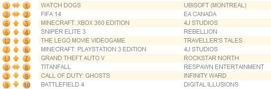 Watch_Dogs до сих пор держит первое место, следом за ним идет FIFA14, а третье место занимает Minecraft для Х360.